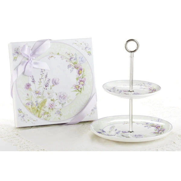 11″ Porcelain 2-Tier Dessert Stand In Gift Box, Lavender Rose