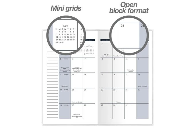 - Each monthly two-page spread has unruled daily blocks, a section for to-do’s and past/future month calendar references