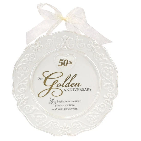 Celebrate a special golden anniversary with this keepsake plate. This dimensional ceramic plate has floral scroll accents and a raised heart. It comes with a ribbon for hanging