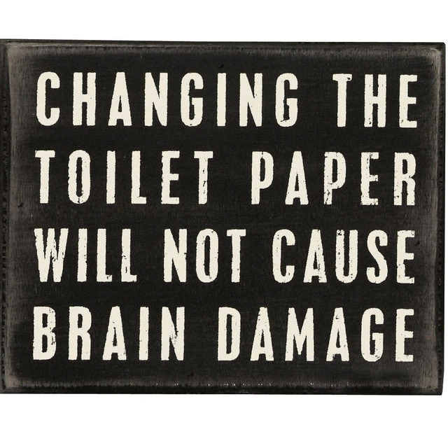 A classic black and white wooden box sign featuring a distressed “Changing The Toilet Paper Will Not Cause Brain Damage” sentiment. Easy to hang or can free-stand alone.