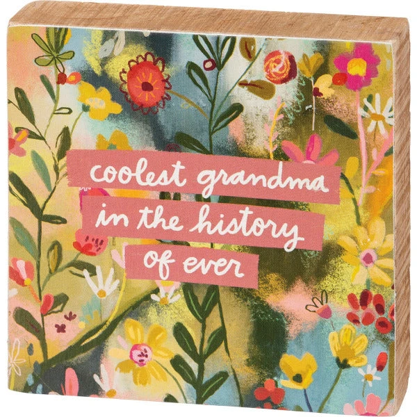 A wooden block sign featuring a vibrant color palette with whimsical floral designs and inspirational words. Sentiment reads “Coolest Grandma In The History Of Ever”. Wooden wall art is easy to hang via predrilled keyhole slot or can free-stand alone. Features natural wood sides.