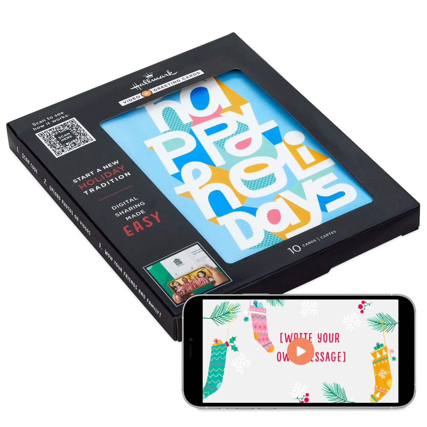 With Hallmark Video Greeting Cards, it’s as easy as 1, 2, 3 to make one-of-a-kind moments that last a lifetime: 1. Scan the code inside one of the cards. 2. Following Hallmark’s prompts, add your photos or videos and choose music. Your video will be used across all cards in the box and can be used on any boxes of video greeting cards. 3. Mail cards to friends and family to enjoy & share! Personalized video greetings available for download up to 6 months after creation. Perfect for sharing a special message of holiday fun and happiness with friends, family and more.