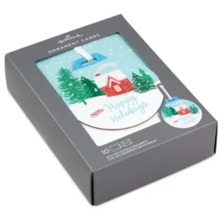 Boxed Christmas cards feature a painting of a cozy red brick home with snow-covered trees on a die-cut, removable ornament. These holiday cards are perfect for sharing a special holiday wish and memento with friends, family and loved ones.