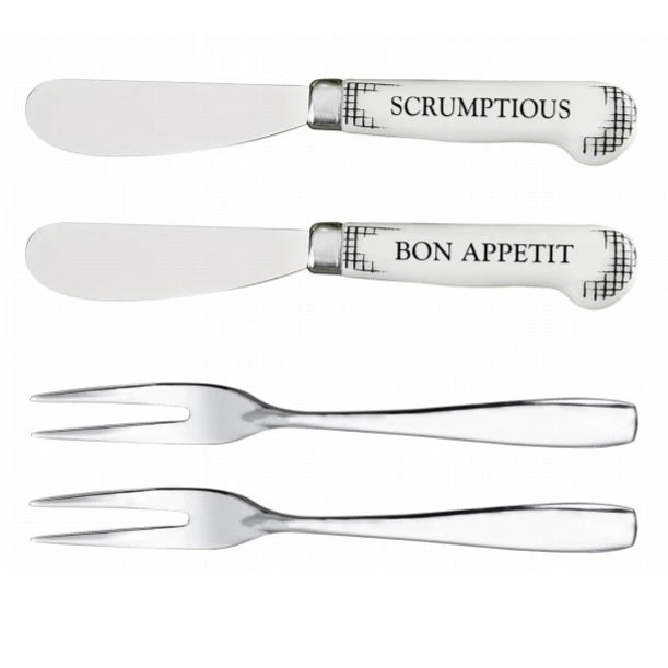 Set of 4 includes 2 spreaders and 2 forksEach 5″LMaterial: MetalGift packaging