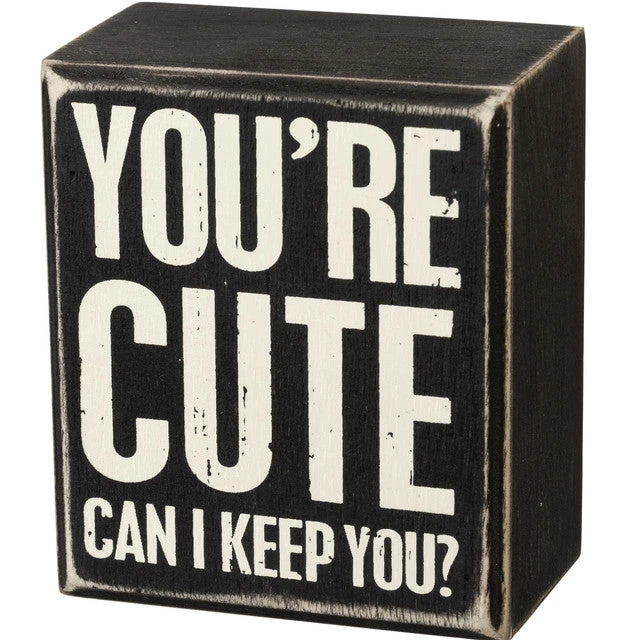 A classic wooden box sign featuring a “You’re Cute – Can I Keep You?” sentiment. Easy to hang or can free-stand alone.